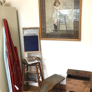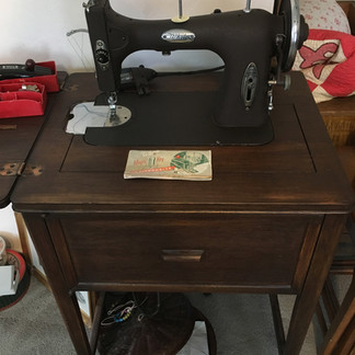 Linens and things; Handmade Quilts; Textiles; Accent Pillows; Towels; Cal. King and Queen size bedding; Vintage ironing board with red paint; blue Coleman iron; White sewing machine in cabinet; accessories & buttons