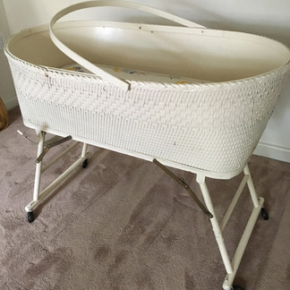 White wicker vintage baby crib, folding legs
